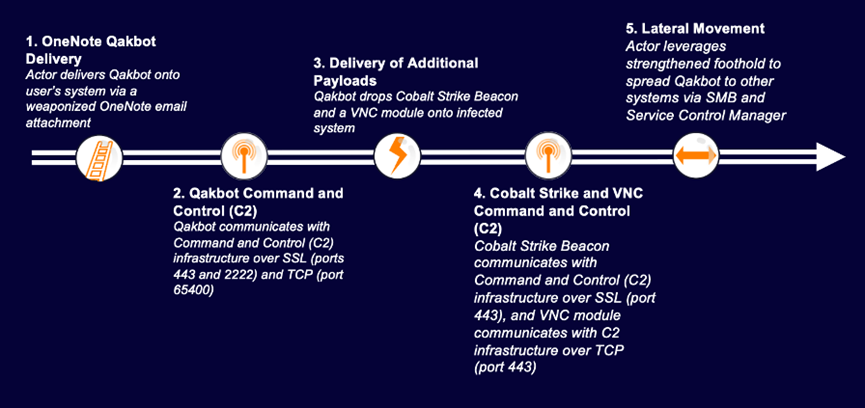 2023年1月底,威胁者开始滥用OneNote附件,将恶意软件Qakbot送入用户的设备。在2023年1月底至2023年2月底期间,广泛采用这种新的传输方法,导致Qakbot感染在客户群中激增。利用其自我学习人工智能,研究人员能够在新趋势出现时发现并应对这些所谓 "QakNote "感染,并且在杀毒链的多个阶段检测到并应对了这种威胁,防止了对客户网络的破坏性和广泛的损害。