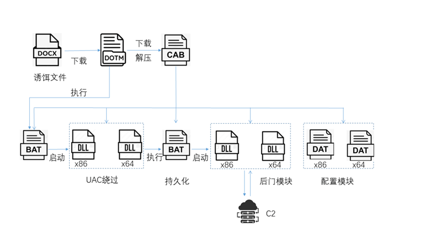 近期研究人员多次发现该组织针对韩国的定向攻击行动。在本轮攻击中,该组织前后使用“奖励清单”、“支付”等具有诱导性的文件名,同时使用“加密货币”、“通讯录”等诱饵内容诱导用户执行恶意宏文档。宏文档被允许执行后,会从自身下载或者释放CAB载荷并解压执行其中的脚本文件,进行一系列恶意样本的加载,从而对受害者发动网络攻击,达到窃密目的。
