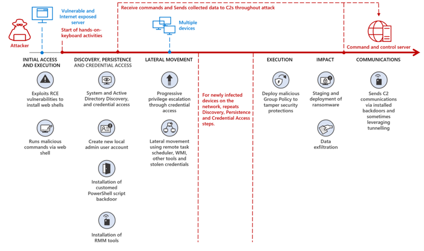 MERCURY 可能利用未修补应用程序中的已知漏洞进行初始访问,然后移交对 DEV-1084 的访问以执行广泛的侦察和发现、建立持久性并在整个网络中横向移动,通常需要等待数周甚至数月才能进入下一阶段。后来观察到 DEV-1084 利用高特权的受损凭据对资源进行大规模破坏,包括服务器场、虚拟机、存储帐户和虚拟网络,并向内部和外部收件人发送电子邮件。