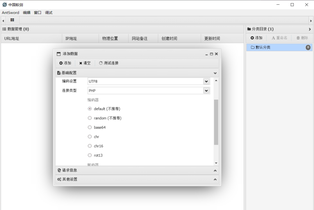 蚁剑编码器这个概念类似于msfvenom中的encoder,将攻击载荷加密或者编码实现免杀,绕过一些防御手段,例如waf、防火墙等等。