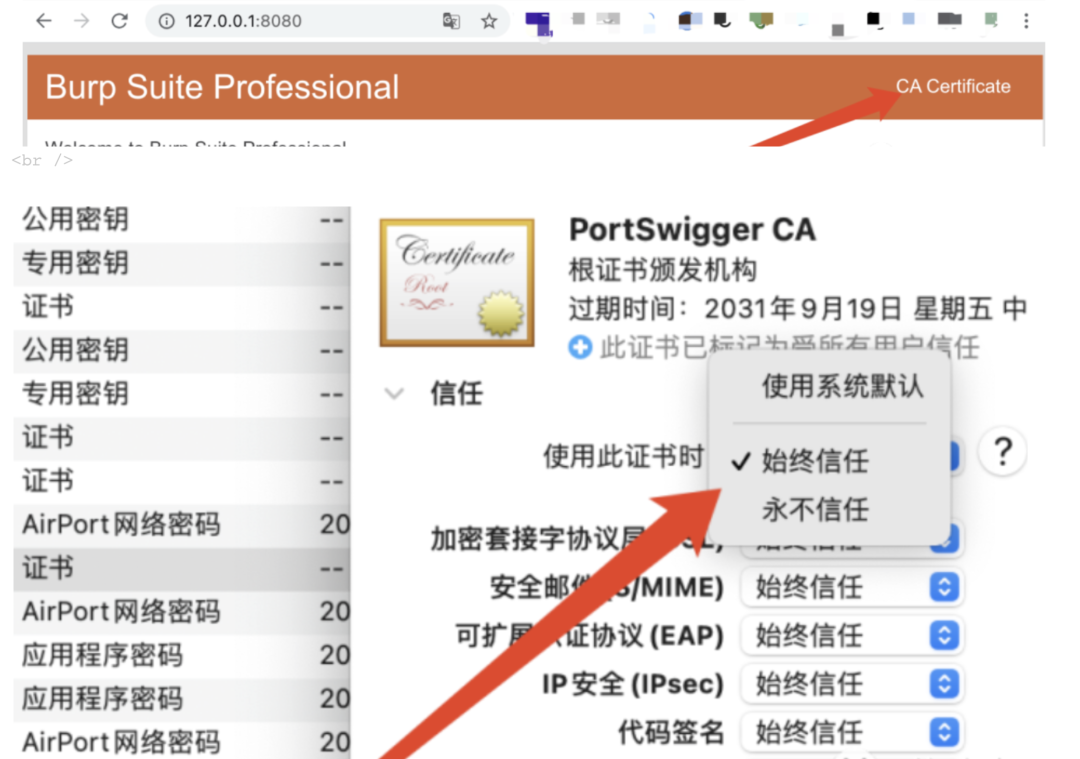 Burpsuite安装这里不过多详细介绍,主要需要下载证书并信任证书