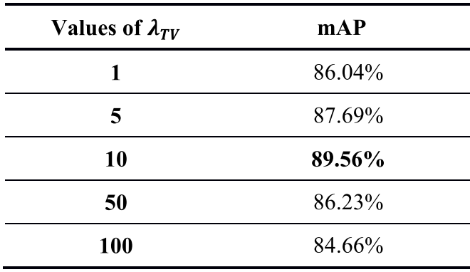 为了凭经验决定由(7)定义的损失函数中使用的TV项的最佳加权系数λTV,使用了不同的值,同时将λfeature、λstyle和λdetection的所有值固定为1,并在表4中报告了相应的检测精度。基于表4,在本研究的所有实验中,λTV被经验性地设定为10。