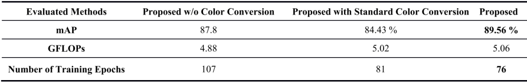 在这项研究中,对以下三种方法进行了评估。第一种是只使用提议的物体检测网络而不加入提议的颜色转换网络(用Proposed w/o color conversion表示)。第二种是采用基于标准色彩空间的色彩转换作为预处理阶段,将输入的彩色图像转换为相应的灰度版本(用Proposed with standard color conversion表示)。此外,第三种方法是本文提出的完整的深度框架,包括颜色转换和目标检测的联合学习(用Proposed表示)。从表2中可以看出,完整的拟议深度模型(具有较少的训练迭代次数和略高的GFLOPs)在目标检测的mAP方面优于没有颜色转换的方法和具有标准颜色转换的方法。