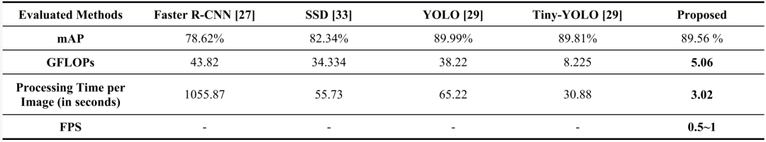为了模拟用于水下环境的电池供电的AUV,在Raspberry Pi 3 B+上实现了基于深度学习的目标检测器,该模型带有ARM CortexA53、1.4 GHz CPU、双核多媒体协处理器GPU、1GB RAM和5.661-W的最大工作功率。使用了四个最先进的目标检测框架进行比较,分别是Faster R-CNN、SSD、YOLO和Tiny-YOLO。在实验中,用于Faster R-CNN、SSD、YOLOv2和YOLOv3框架的骨干分别是VGG-16、ResNet-101、Darknet-19和Darknet-53。同样的数据增强技术(提出的训练样本生成方法)被用于训练所有被评估的用于目标检测的深度模型。这四种被比较的方法也在同一平台上实现,并与所提出的方法一起进行评估,评估内容包括目标检测的平均精度(mAP)、所需的千兆浮点运算(GFLOPs)、每幅图像的平均处理时间(秒)和每秒处理的平均帧数(FPS,即帧率),用于系统性能评估。如表1所示,从计算复杂性的角度来看,所提出的方法在GFLOPs、每幅图像的处理时间和FPS指标方面明显优于这四种最先进的方法。需要注意的是,四种对比模型过于复杂,无法嵌入到所使用的树莓派平台来处理多个连续的帧。它们通常可以处理一帧,而在处理下一帧时,系统就没有资源了。