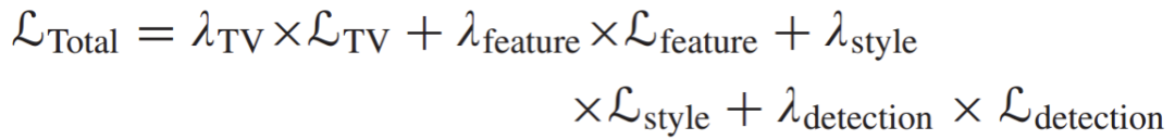 其中四个加权系数(λTV、λfeature、λstyle和λdetection)根据经验被分别设置为10、1、1和1。