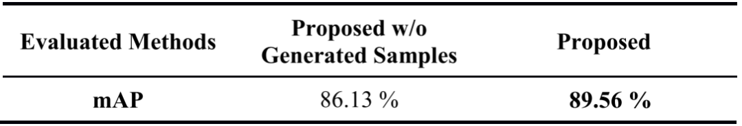 通过只使用真实的训练样本,排除生成的训练图像,来训练另一个物体检测器(用proposed w/o generated samples表示)。为了训练没有生成的训练样本的深度模型,遵循与之前描述的带有生成的训练样本的拟议深度模型相同的参数设置。表3显示了由无生成样本的方法和完整的拟议框架(有生成的训练样本)获得的物体检测的mAP性能。从表3中可以看出,人为地增加训练样本确实会带来更好的物体检测性能。