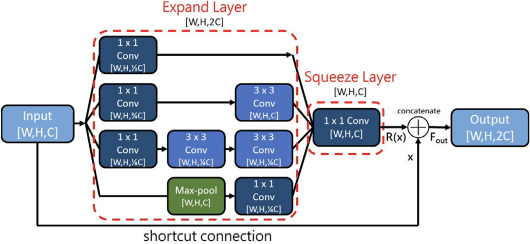 为了弥补可能出现的特征提取不充分的问题,提出了感受模块来进一步完善前一特征提取CNN模块的特征。感受模块用于有效地提取输入特征图的多尺度特征。主要目标是在低计算复杂度下保持特征表示能力。如图4所示,拟议的感受模块由一个扩展层、一个挤压层和一个快捷连接组成。扩展层是基于inception v3架构。在低维嵌入上可以实现空间聚合,而不会有明显的表示能力损失。扩展层的结构与inception v3不同,也比它简单(有更多的卷积层和更大的内核尺寸)。此外,用多尺度处理扩展网络有利于提取多尺度特征,这对检测图像中较大或较小的物体很有用。在扩展层之后是挤压层,它只进行一次1×1的卷积运算,以减少特征通道的数量。为了保留感受模块的输入特征图并避免梯度消失的问题,使用了一个快捷连接来直接传输输入,与挤压层的输出相连接,形成感受模块的输出。然后,感受模块的输出被送入卷积运算,内核大小为3×3,跨度大小为1。