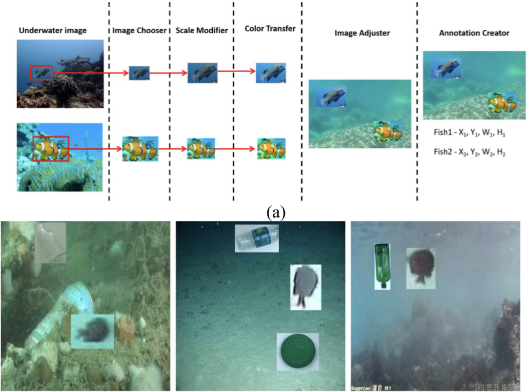 为了将目标自然地融合到水下背景图像中,色彩转换模块首先将所有的目标和背景图像从RGB(红、绿、蓝)色彩空间转换到HSI(色调、饱和度和强度)色彩空间。然后,目标图像的色调值被调整为与其目标水下背景图像的色调值相近:对于要融合到水下背景图像B中的目标图像O,将B的所有像素的平均色调值(H_B)分配给O的每个第i个像素的色调值(Hi_O),即,设置所有i的Hi_O = H_B,O的饱和度和强度值保持不变。因此,目标图像可以与背景图像融合。此外,图像调整器模块被用来随机调整背景图像中要粘贴的目标(可能是旋转了一些角度)的位置。最后,“Annotation Creator”用于为每张融合的图像注释附加信息,包括每个目标i的中心点坐标(Xi和Yi)、宽度(Wi)和高度(Hi)。图1(b)显示了一些由提议的生成过程(图1(a))获得的水下图像用于的深度模型学习。