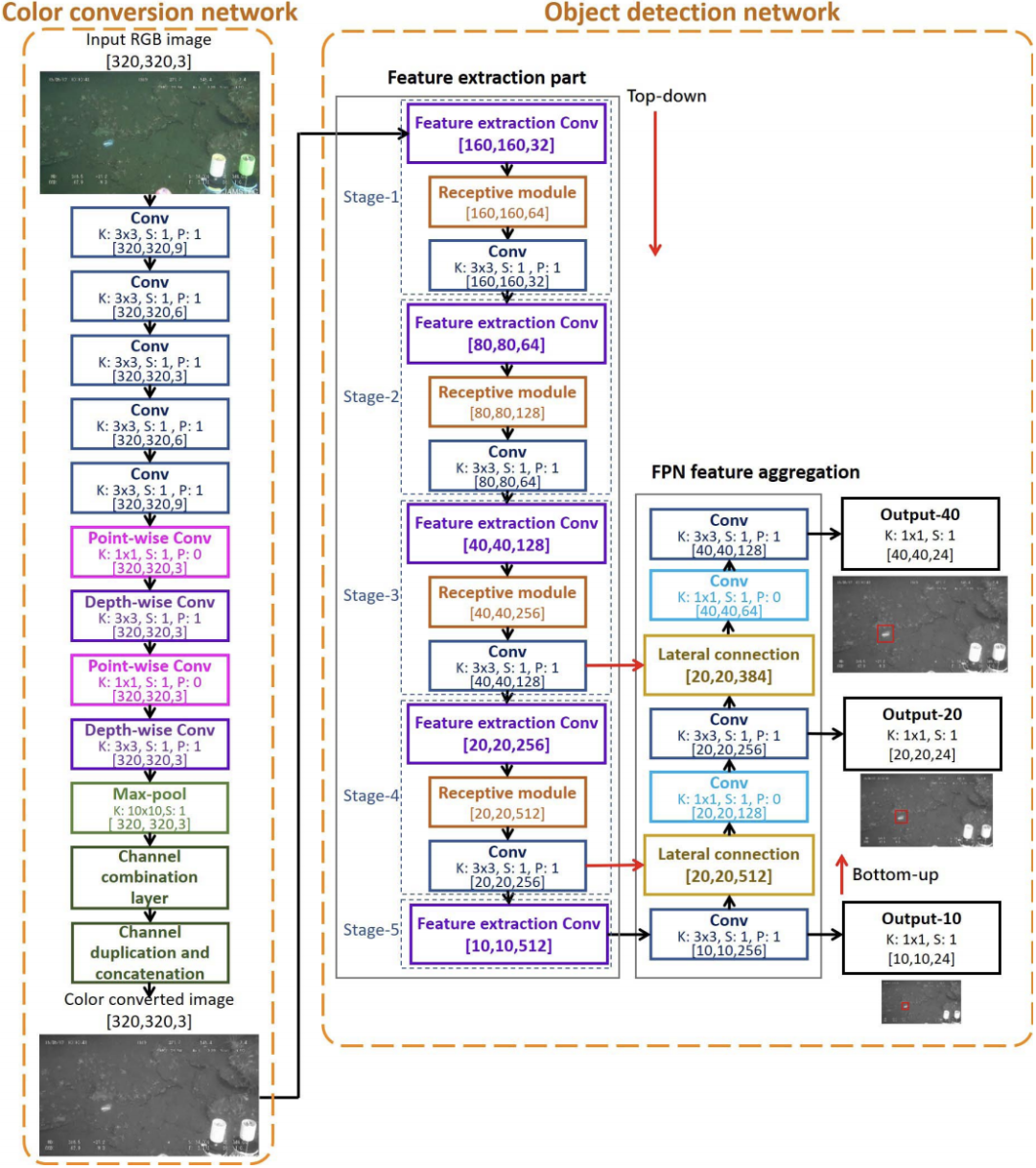 如图2所示,所提出的用于水下目标检测的轻量级深度神经网络主要由图像颜色转换网络和水下目标检测网络组成。通过整合多尺度预测的FPN的想法,采用了轻量级实现目标检测网络。此外,为了在方法中嵌入水下图像特征,使用联合学习所提出的颜色转换网络和所提出的目标检测网络,用于调整水下图像的颜色信息,同时实现更好的目标检测性能。