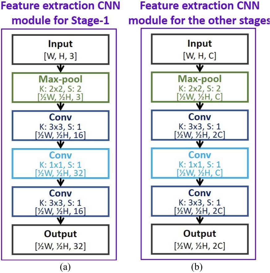 如图3所示,特征提取CNN模块包括一个输入层,然后是一个max-pooling层、三个卷积层和一个输出层。特征提取CNN模块主要用于提取初始特征,将输入特征图的空间大小减半。第一阶段的特征提取CNN模块采用了1×1的卷积运算,核大小为1×1×32,使通道大小增加一倍。其主要目的是为了增加初始阶段的特征图,以便后续的特征提取过程。另一方面,对于后续阶段使用的每个特征提取CNN模块,1×1卷积运算被用来将通道大小减半,以减少特征大小并降低计算复杂性。
