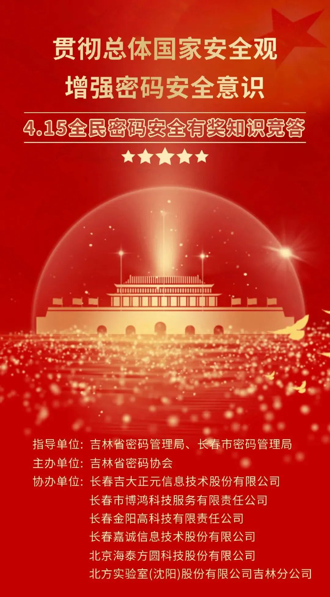 今年4月15日是第八个全民国家安全教育日,为贯彻总体国家安全观,增强全民国家安全意识和素养,由吉林省密码管理局、长春市密码管理局指导、吉林省密码协会主办,长春嘉诚信息技术股份有限公司(简称嘉诚信息)及其他5家科技公司联合协办的“4•15”全民密码安全有奖知识竞答于今日正式拉开帷幕。