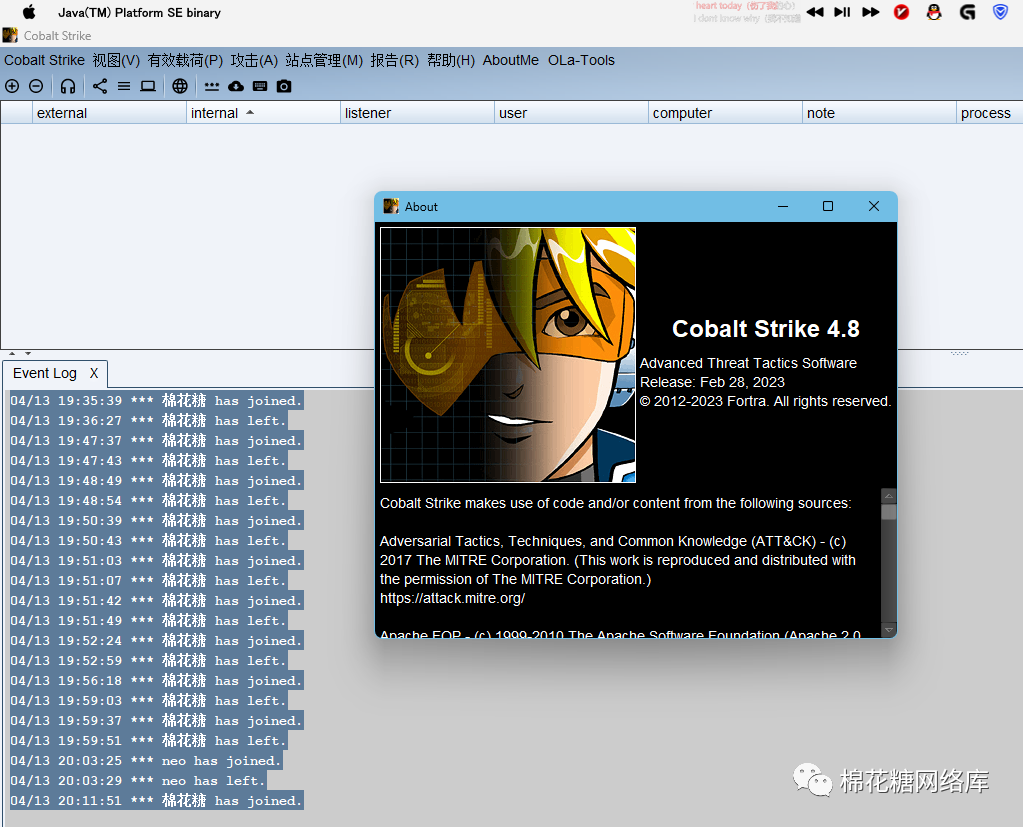 有没有外联请自查噢 将server文件夹上传到java11环境的linux 然后使用以下命令启动 ./teamserver ip 密码使用java11环境的windows 双击client文件夹下的Cobalt_Strike_CN.vbs 即可汉化启动 默认连接端口50050