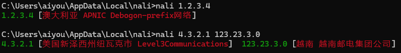 $ nali 1.2.3.4 4.3.2.1 123.23.3.01.2.3.4 [澳大利亚 APNIC Debogon-prefix网络]4.3.2.1 [美国 新泽西州纽瓦克市Level3Communications]123.23.3.0 [越南 越南邮电集团公司]