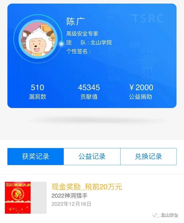 2022年双十一业务安全保卫战-某厂第一名,某厂特邀数字业务安全研究员、网络安全专家库讲师,渗透测试工程师,CSDN2022年运维与安全领域Top1、年度博客之星Top17、网络安全领域优质创作者,edusrc高级白帽等。