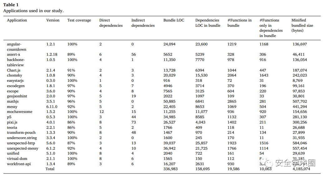 实验选择了 22 多个流行 JavaScript 应用程序进行测试,要求其满足以下条件: