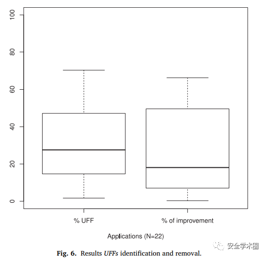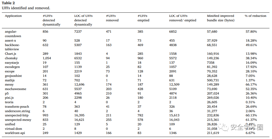表 2 展示了本次实验发现、去除、清空的 UFF 数目。可以发现本次针对这些项目共去除了 7021 个 UFF。其中 30.5% (2142) 被完全去除、69.5% (4879) 被清空。然而在整个实验中发现几乎在包中使用的函数,一半来源于依赖的第三方包,函数总数 19,586,其中 10,063 (51.38%) 属于库;同时 bundle LOC(line of code)总数为 336,983,其中 158,695 (47.09%) 属于依赖库。因此分析属于依赖库的函数以删除不需要的函数很重要。