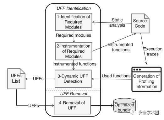 本文的目标就是对去除这些依赖项中不必要的源代码(UFF,unused Foreign Function),从而缩小程序大小。具体开发了一种名为 UFF Remover 的工具。