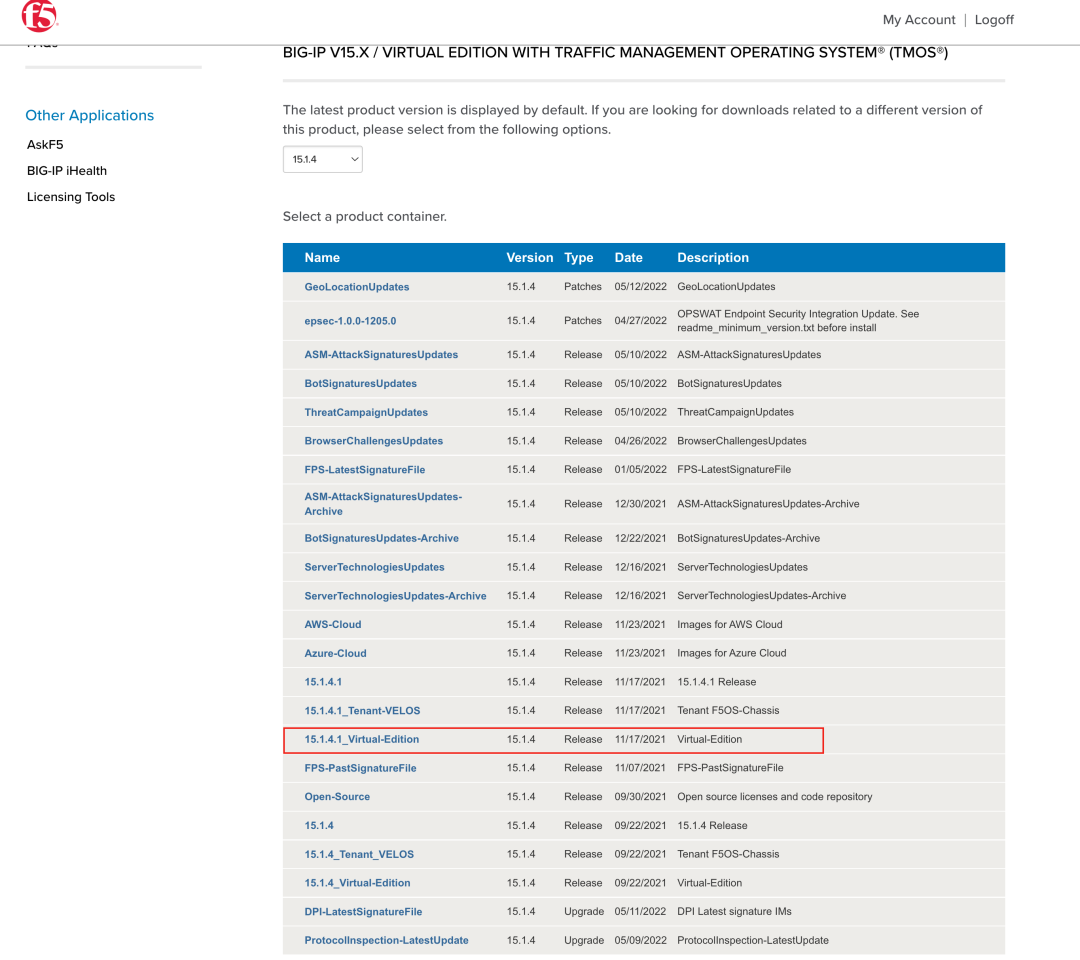 下载链接https://downloads.f5.com/esd/product.jsp?sw=BIG-IP&pro=big-ip_v15.x&ver=15.1.4