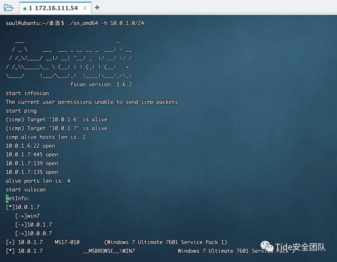 发现该网段10.0.1.7服务器存在ms17010漏洞,并且也提示为双网卡机器