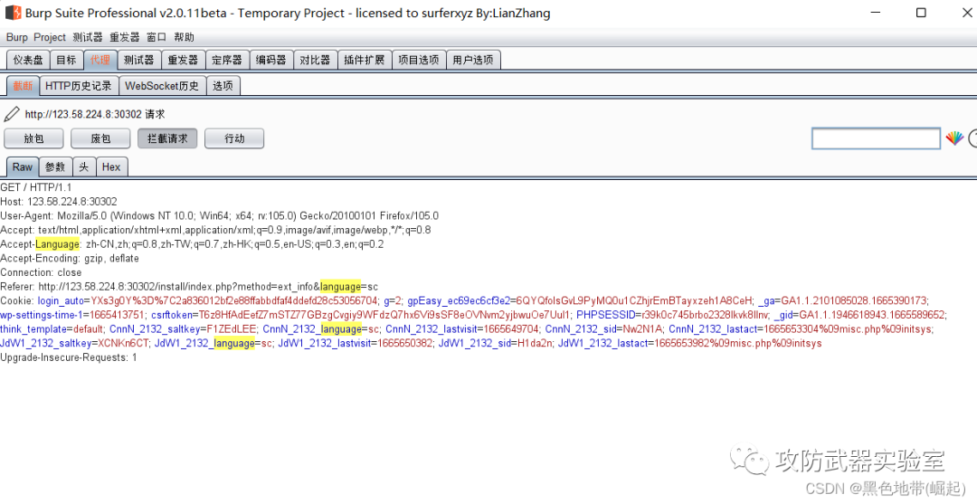 数据包中cookie中的language时漏洞点