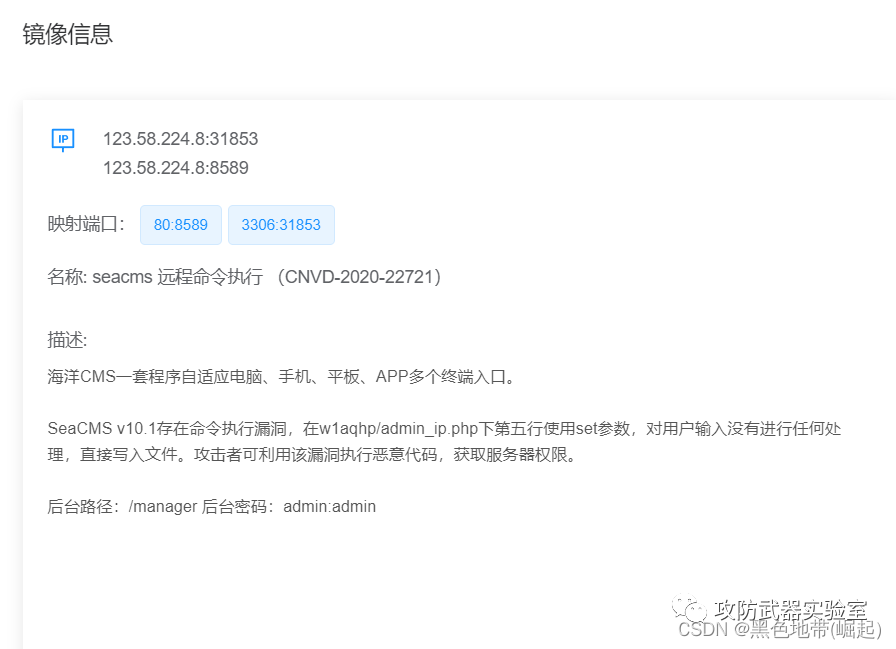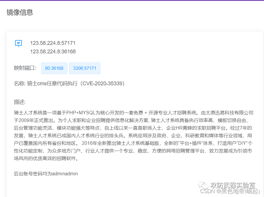 | 【漏洞复现-骑士cms-代码执行】vulfocus/骑士cms_cve_2020_35339 | 后台配置中植入命令 |