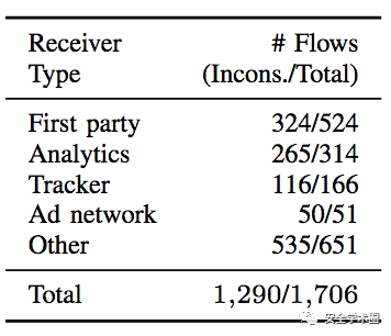 (3)端到端一致性检测的precision为85%。大部分误报是由于扩展并未收集数据的回调函数被包括在网络流量的发起者中了,例如,一个扩展安装了一个HTTP请求事件处理程序来检查HTTP请求中URL pattern是否出现,但它没有进行任何数据收集。