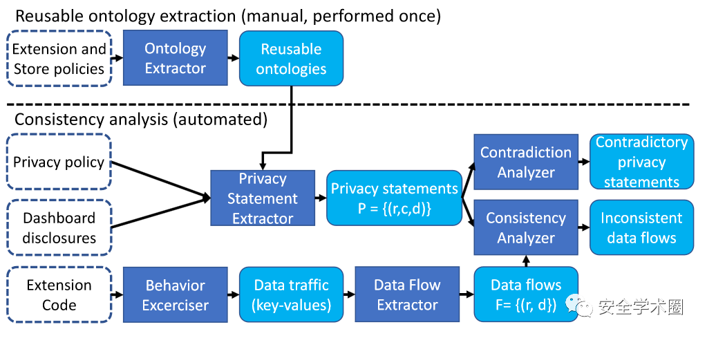 浏览器扩展被要求通过各种形式向用户公开他们的隐私政策,但是其所声明的隐私策略可能与实际收集的用户数据之间存在差别。为了检测这种不一致,作者提出了自动化检测框架ExtPrivA,它提取浏览器扩展在隐私政策文档和Dashboard中声称的隐私策略,然后进行动态分析,模拟用户交互以触发扩展的功能,并分析网络请求的发起者,以准确提取扩展从浏览器传输到外部服务器的用户数据,将其和声明的隐私策略对比,检查是否存在不一致。