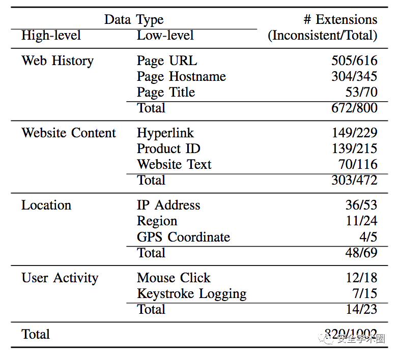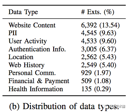 ExtPrivA从数据流量键值对中,为1,002个扩展接收到的数据类型抽取了1,706条唯一数据流。每个扩展平均收集1.7个数据类型。从扩展中提取的最常见的数据类型是当前访问的网页的URL和Hostname,属于Web History高级数据类型。这些数据类型是隐私敏感的,因为可以用于构建用户的网页浏览习惯。表2显示了抽取的数据类型在扩展上的分布。