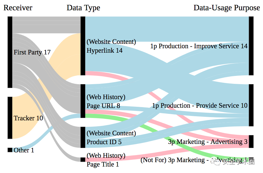 作者还分析了扩展收集数据的目的,结果显示其主要目的是用于改进或提供服务,最常见的数据类型是网站内容(超链接和产品ID)和Web历史(当前访问页面的URL)。图3给出了数据使用目的的分解图。