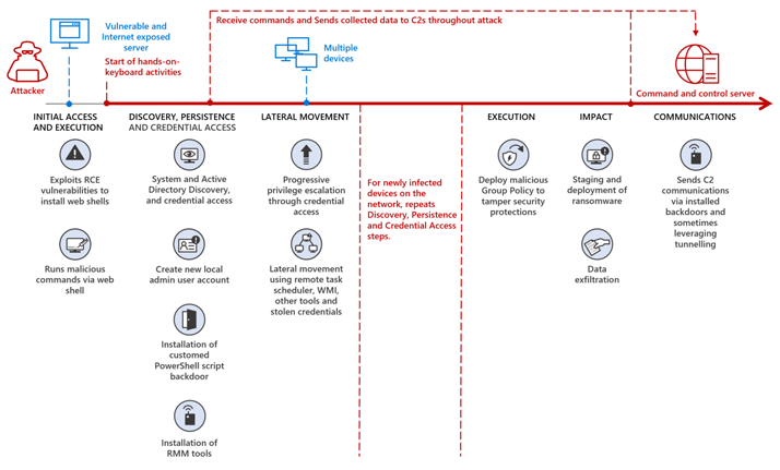 MuddyWater 组织可能利用未打补丁的应用程序中的已知漏洞进行初始访问,通过 Exchange Web 服务获得了对电子邮件收件箱的完全访问权限,并使用它执行“数千次搜索活动”并冒充一名未署名的高级员工向内部和外部收件人发送消息。随后,DEV-1084 获得访问权限后执行广泛的侦察和发现、建立持久性并在整个网络中横向移动,通常等待数周甚至数月进入下一阶段。最终,威胁组织利用高特权受损凭据,对本地设备进行加密并大规模删除云资源,包括服务器、虚拟机、存储账户和虚拟网络。