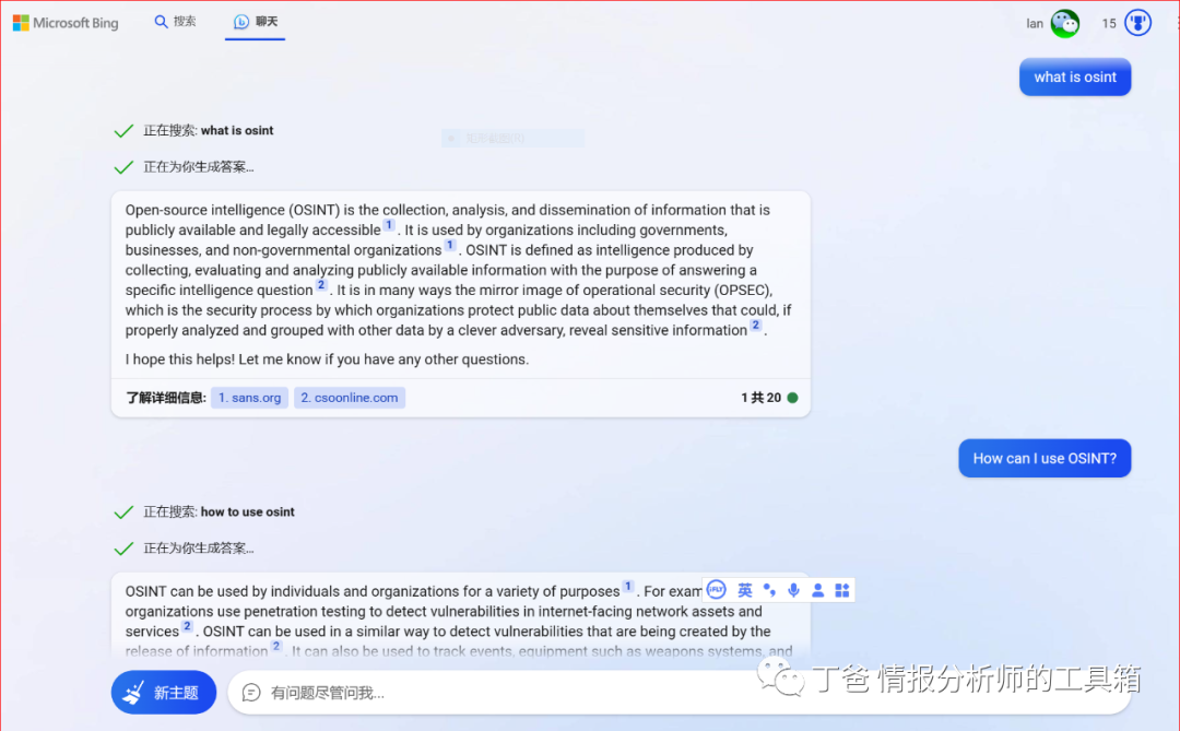 选择聊天功能,可让AI回答你的提问,用中文提问,AI选择中文语料库,用英文提问,必应选择英文语料库回答。因此,用户可根据自己的需要选择提问的语言类型。