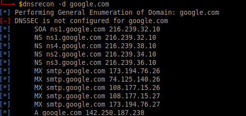 dnsrecon 是一个用于枚举 DNS 记录(MX、SOA、NS、A、AAAA、SPF 和 TXT)的 pyhton 工具,并且可以提供许多新的关联受害者主机以从单个域搜索中转向。