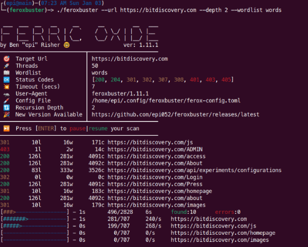 # Read URLs from stdincat targets | ./feroxbuster --stdin --silent -s 200 301 302 --redirects -x js | fff -s 200 -o js-files