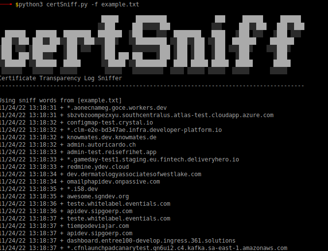 certSniff 是用 Python 编写的证书透明度日志关键字观察器。它使用 certstream 库来监视包含在文件中定义的关键字的证书创建日志。