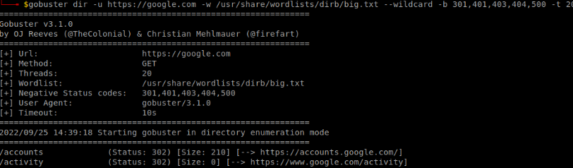gobuster dir -u "https://google.com" -w /usr/share/wordlists/dirb/big.txt --wildcard -b 301,401,403,404,500 -t 20