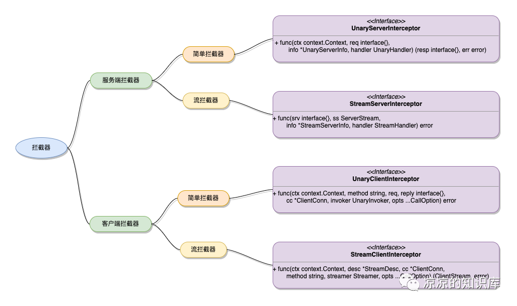 上一篇提到gRPC的通信模式分为unary和streaming几种模式,拦截器也分为两种:unary interceptors和streaming interceptors ,两种拦截器可以分别应用在服务端和客户端,所以gRPC总共为我们提供了四种拦截器。它们已经被定义成了go中的接口,我们创建的拦截器只要实现这些接口即可