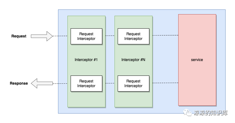 服务端的拦截器从请求开始按顺序执行拦截器,在执行完对应RPC的逻辑之后,再按反向的顺序执行拦截器中对响应的处理逻辑