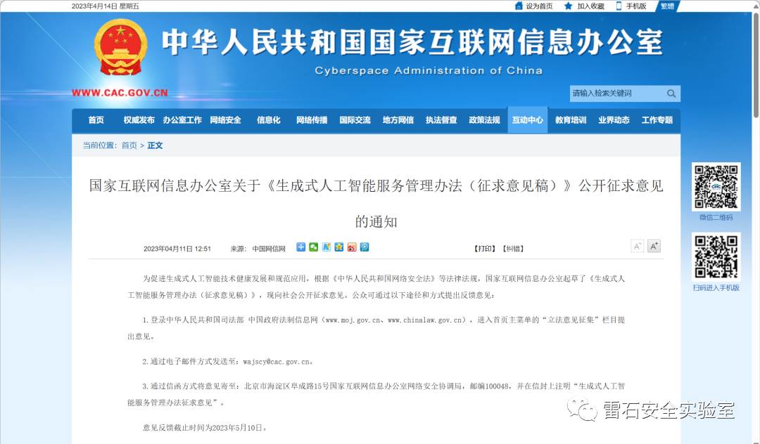 3、ChatGPT法规来了!国家网信办发布《生成式人工智能服务管理办法(征求意见稿)》