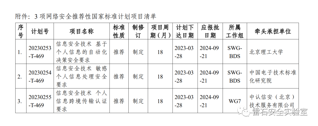1、信安标委下达3项网络安全推荐性国家标准计划
