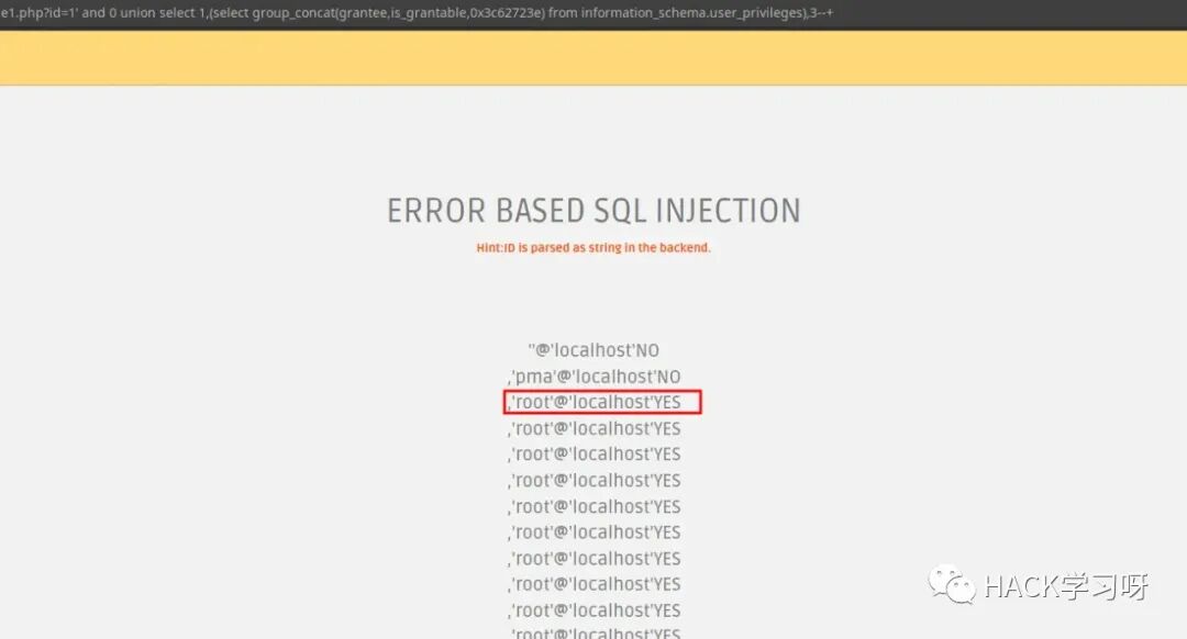我们将执行查询“(select group_concat(grantee,is_grantable,0x3c62723e) from information_schema.user_privileges)”我得到了这样的输出