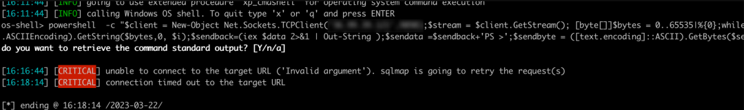 然后利用powershell进行反弹。发现被封ip(在执行其他命令时没有封禁ip,猜测有waf以及杀软)