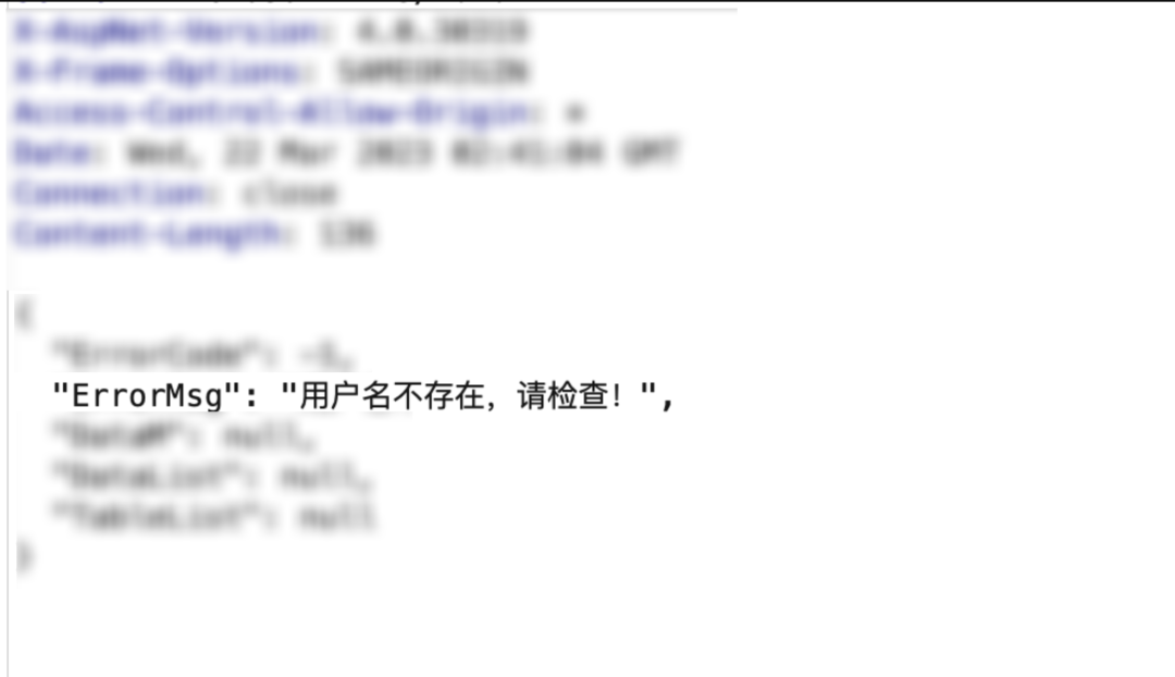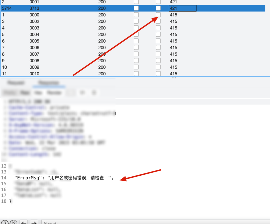 那么问题就来了,要么统一返回的都是“用户名不存在”,要么是真的没有碰到用户名,既然普通的用户字典没有成功,那么可以考虑下是不是工号,一般为4位或者6位数字,再次进行爆破。终于出现两个不一样的东西