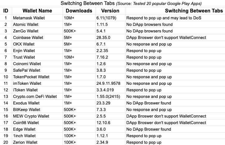 4. 部分钱包 App 如 Exodus Wallet 和 Edge Wallet 在连接测试环境下未找到相关的 DApp 进行测试,无法判断其切换界面后的响应情况。